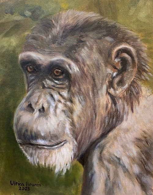 Schimpansens blick förmedlar en klokhet som bara ett djur kan göra. Den här målningen sprider en klokhet som bara naturens närvaro kan göra.